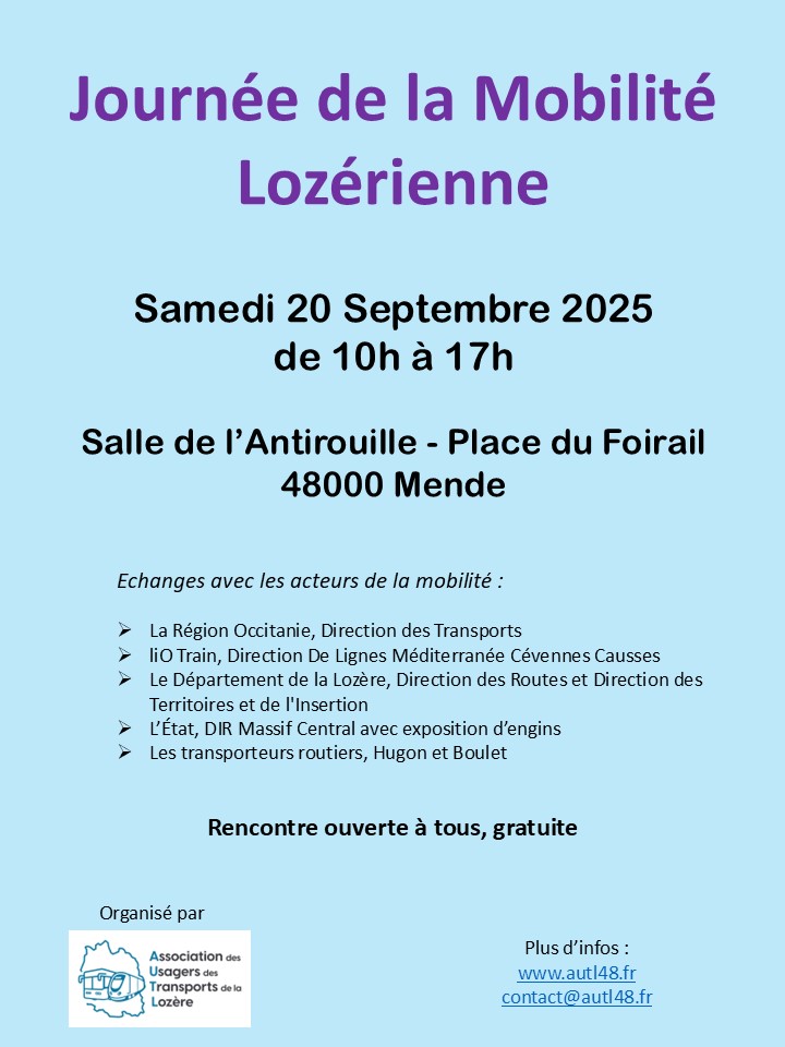 Le samedi 20 septembre 2025 se tiendra à Mende la 1ère journée de la mobilité Lozérienne. Une occasion unique de découvrir et d’échanger avec les acteurs de la mobilité : la Direction des transports...